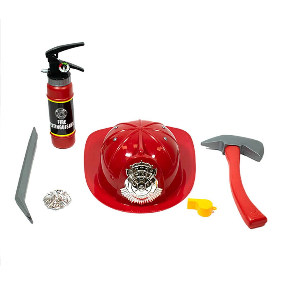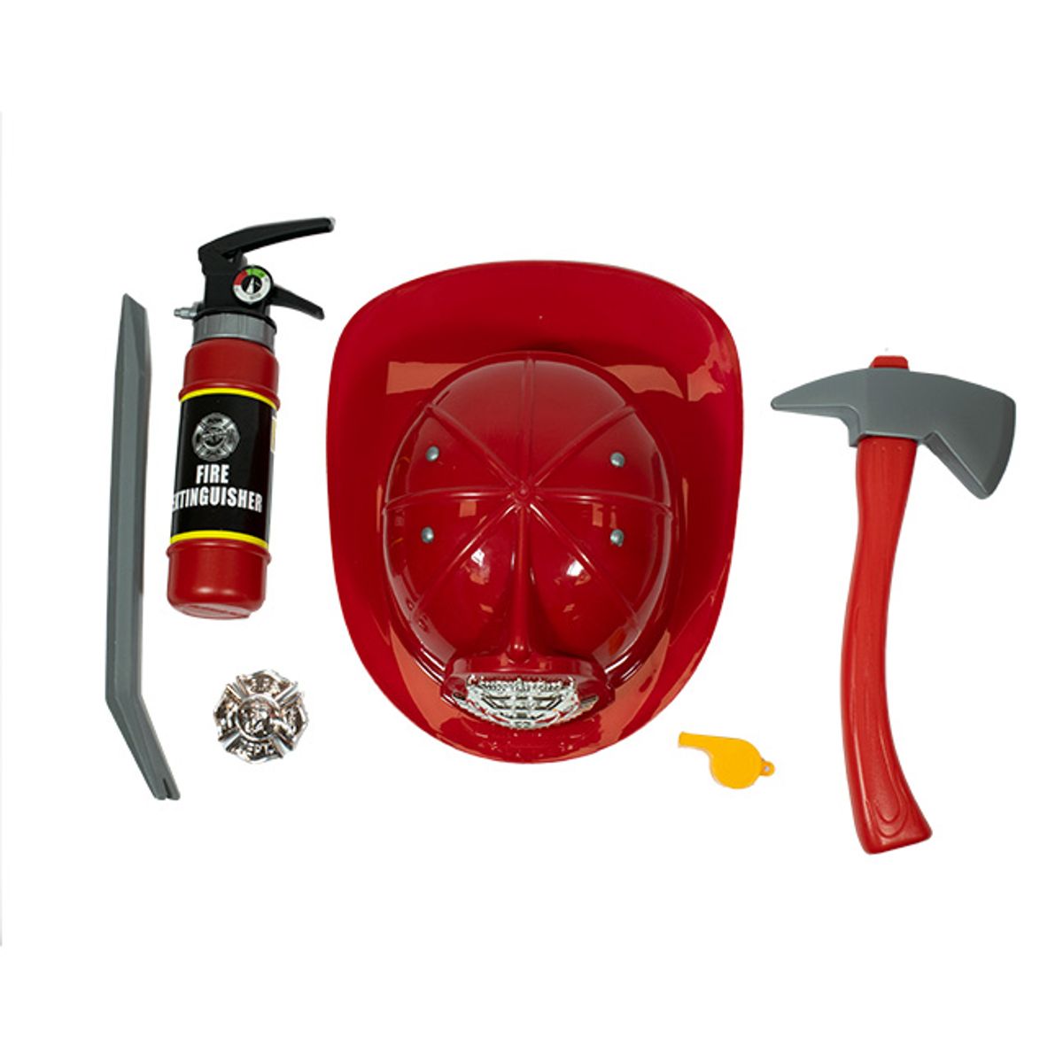 Set bombero. Casco, palanca, hacha, extintor